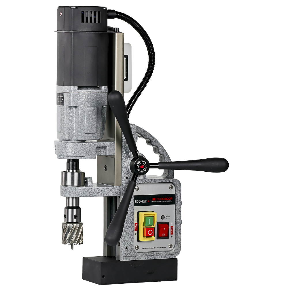 Onze compacte Euroboor ECO.40/2+ is de perfecte kernboormachine voor kernboren tot 40 mm (1 9/16″) en spiraalboren tot 13 mm (1/2″). De innovatieve elektronica in deze magnetische kernboormachine bieden meer veiligheid, zorgen voor een aanzienlijke vermindering van de risico’s op beschadiging van de machine, gereedschap en werkstuk én de gebruiker beschermen bij overmatige trillingen of plotselinge verplaatsing. De levensduur is aanzienlijk langer en hoge onderhoudskosten worden voorkomen. Deze lichte en betrouwbare magneet boormachine is een ware toevoeging voor iedere werkplek.