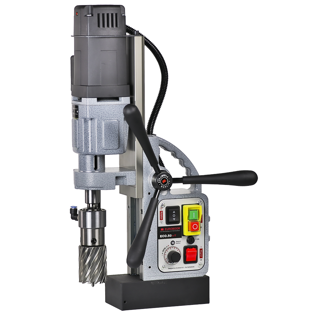 Onze ECO.50-T magneet kernboormachine is geschikt voor zowel boren als tappen. De Euroboor ECO.50-T met Morse Conus 2 as is voorzien van innovatieve elektronica die nóg meer veiligheid bieden, zorgen voor een aanzienlijke vermindering van de risico’s op beschadiging van de machine, gereedschap en werkstuk én de gebruiker beschermen bij overmatige trillingen of plotselinge verplaatsing. De levensduur is aanzienlijk langer en hoge onderhoudskosten worden voorkomen.