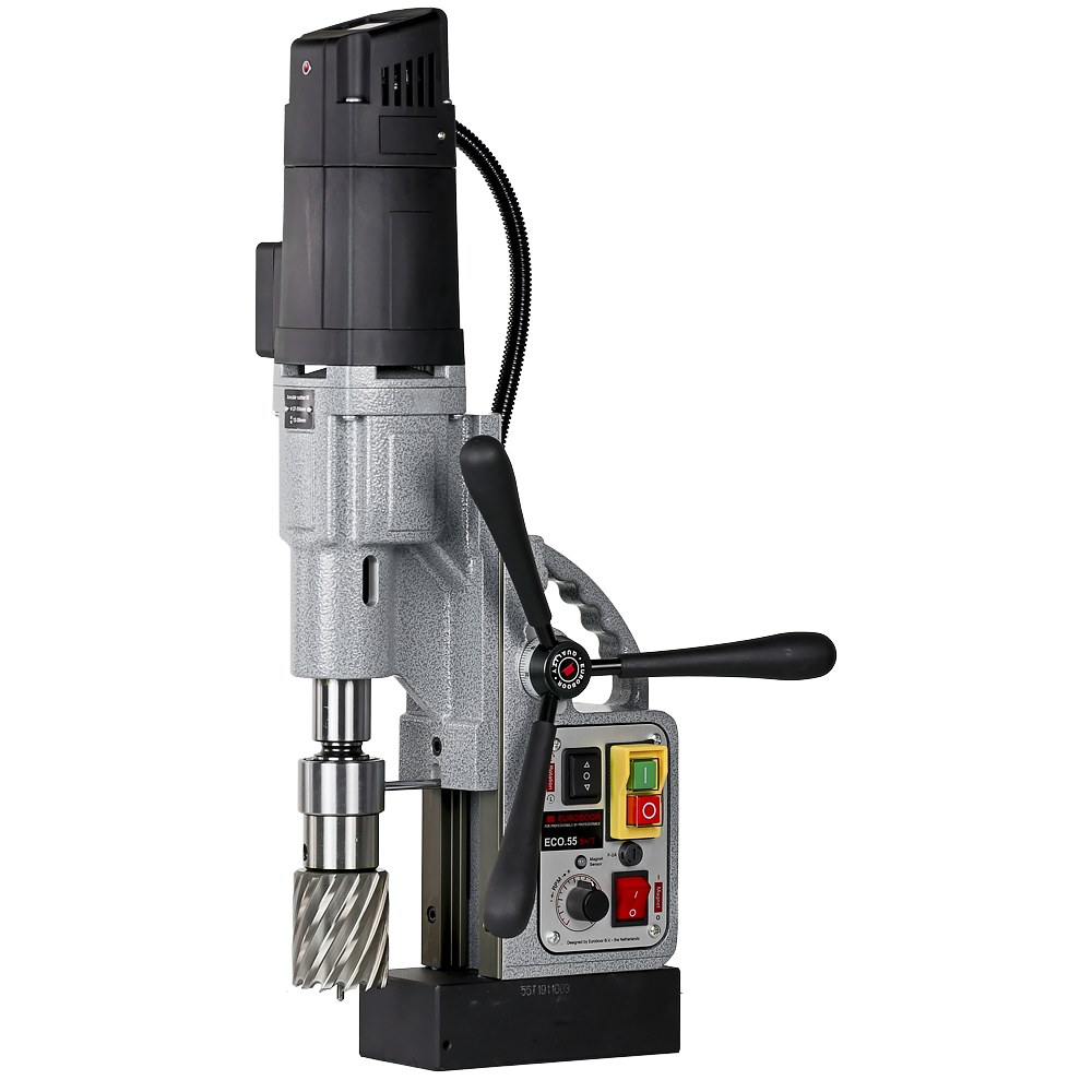 De Euroboor ECO.55S+/T Kernboormachine profiteert niet alleen van Smart Restart-technologie en een digitaal display dat de ideale werkbelasting weergeeft, maar ook van een olie gesmeerde versnellingsbak én innovatieve elektronica die nóg meer veiligheid bieden, zorgen voor een aanzienlijke vermindering van de risico’s op beschadiging van de machine, gereedschap en werkstuk én de gebruiker beschermen bij overmatige trillingen of plotselinge verplaatsing. De levensduur is aanzienlijk langer en hoge onderhoudskosten worden voorkomen.