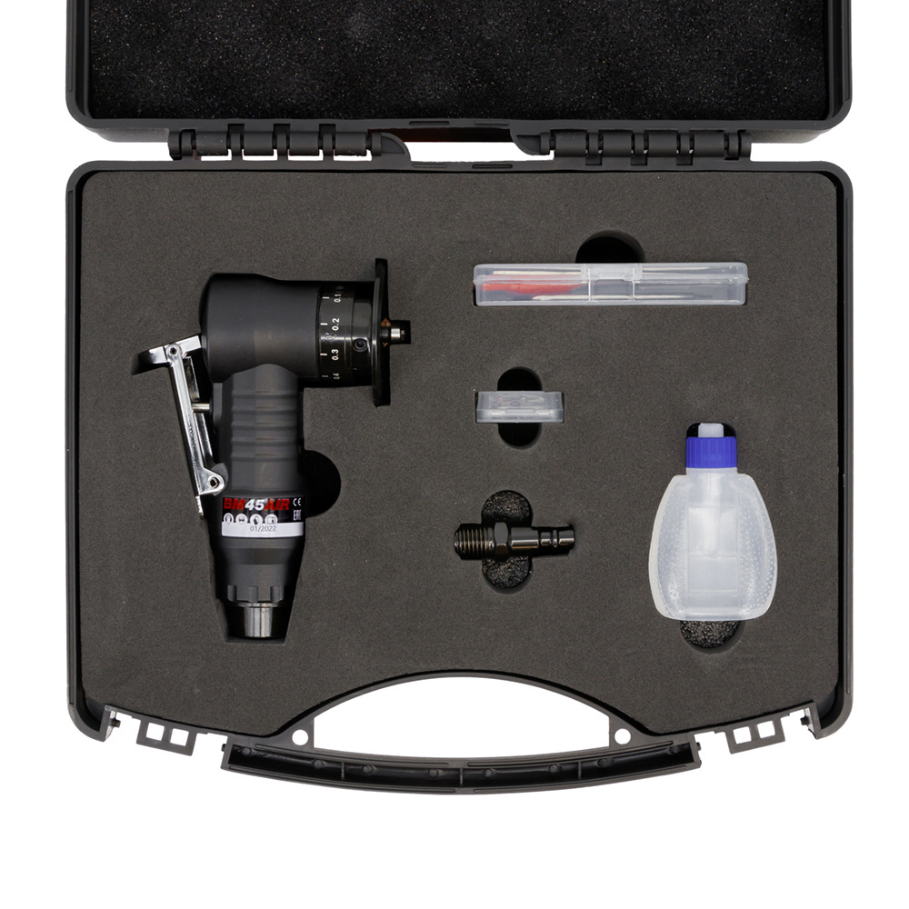 De freesmachine BM45AIR van Euroboor is de kleinste afschuinmachine in het assortiment. De BM45AIR is ontworpen voor het ontbramen en afronden van randen op staal, RVS, aluminium en andere materialen. Uitermate geschikt voor het bewerken van gaten met een binnendiameter van 8mm. Laskanten freesmachine / maximum toerental onbelast 28000 / Voedingsbron aansluiting: luchtslang aansluiting met binnendiameter 3/8″.
