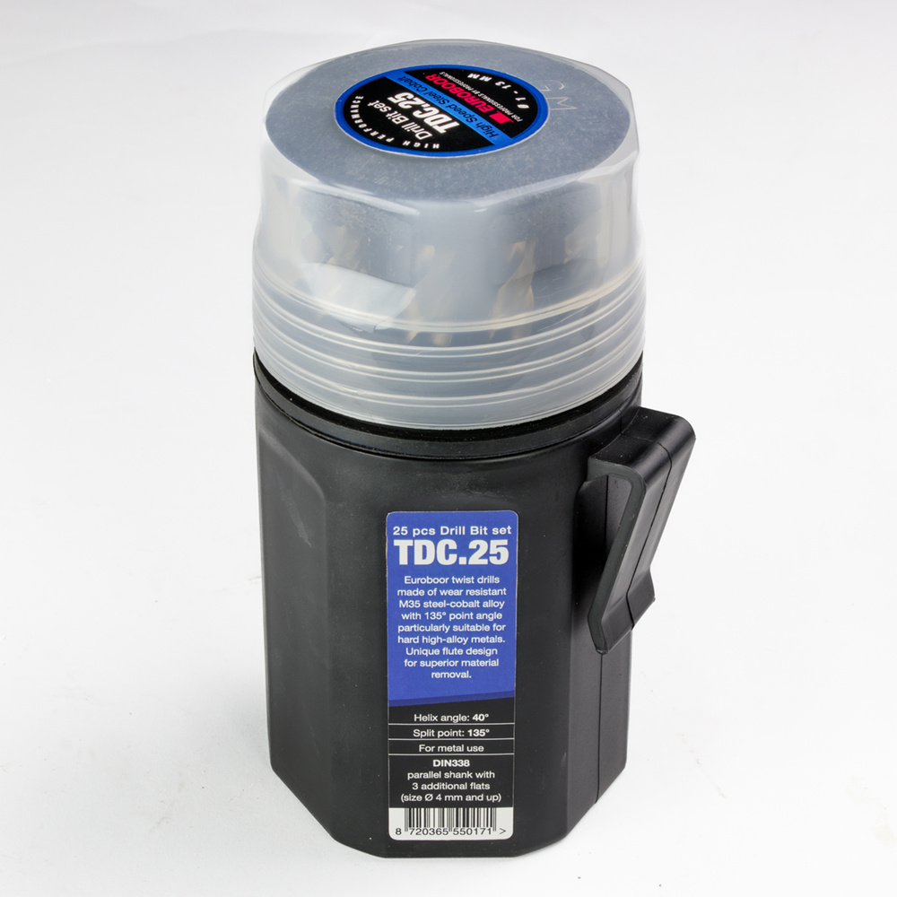 Euroboor Spiraalboor set HSS-Co, set bevat 25 spiraalboren. Verpakt in kunststof houder