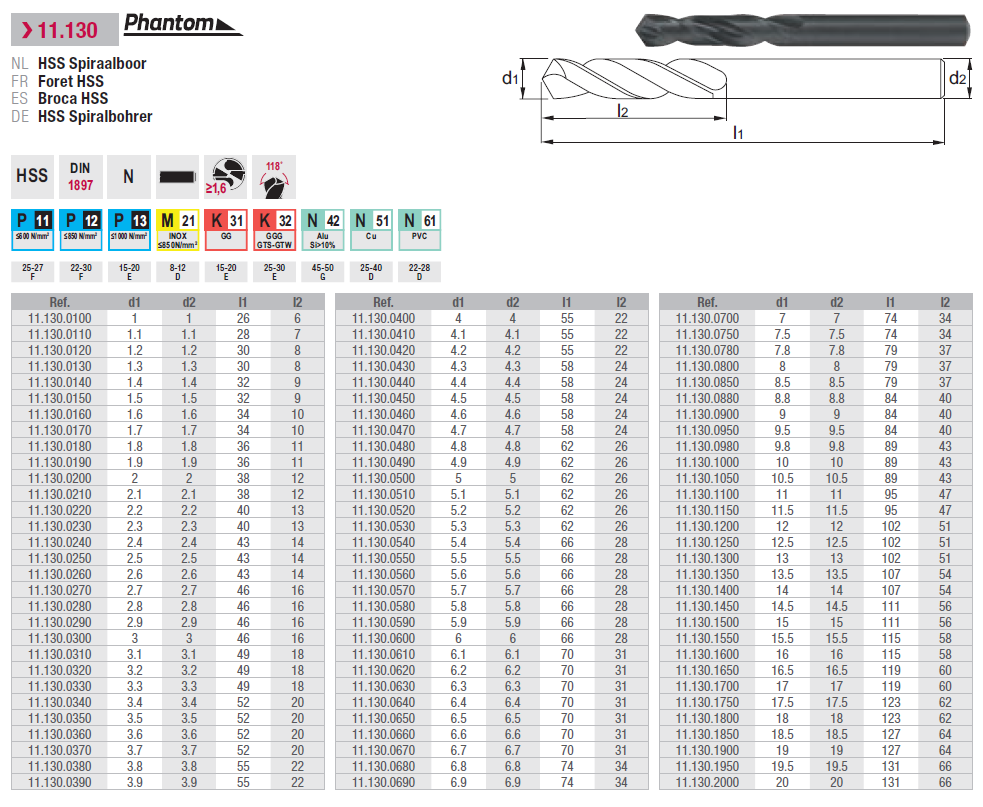 Deze HSS Spiraalboor is uitermate geschikt voor gelegeerd en ongelegeerd staal <1000 N/mm². En minder geschikt voor roestvasstaal INOX <850N/mm², grijs gietijzer en smeedbaar en nodulair gietijzer.