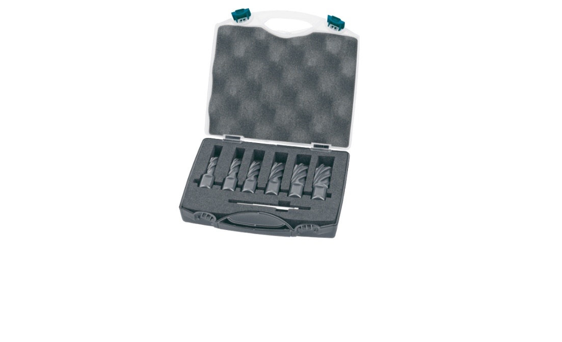 Deze Phantom kernboor set bestaat uit een 7-delig koffer. Met 6 verschillende daimeters kernboren: 12-14-16-18-20-22 en een uitwerpstift 62.300.0025. Deze kernboren hebben een korte uitvoering, met een 2-vlaks (19,05mm) Weldon opname en gevuld met kernboren uit artikelgroep 62.122.