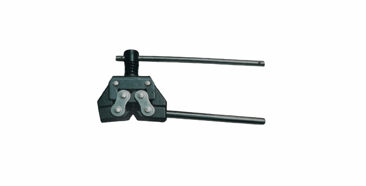 Een kettingbreker wordt gebruikt om een industriële ketting volledig te openen. De breker drukt de pen helemaal door de schakel, zodat de ketting in twee delen uit elkaar valt.