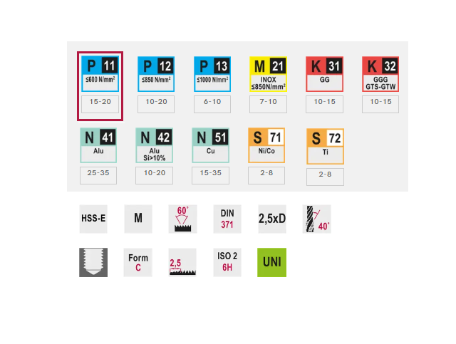 DIN 376, 60°, dunne schacht, spiraalhoek 40°, voor blinde gaten, aansnijding 2,5 gangen, snijlengte 10 gangen teruglopend naar de 5e gang